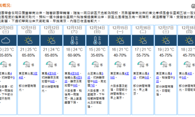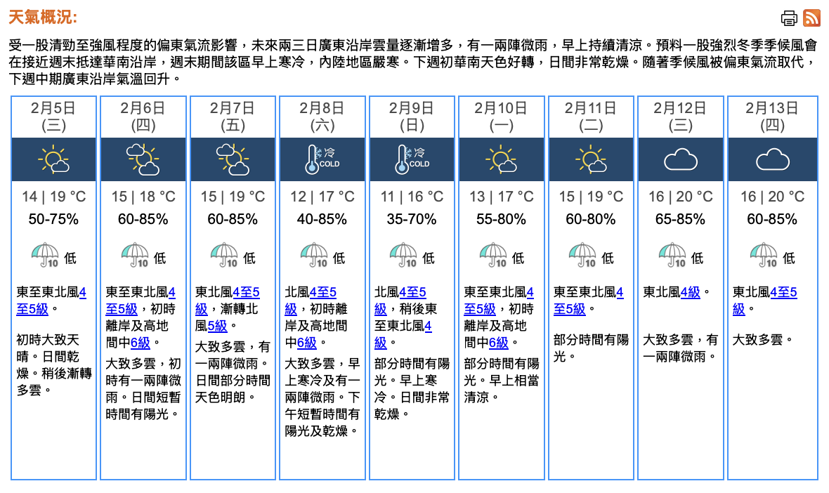 即時熱點 天氣|天文台:周三早上相當清涼 市區最低14℃ (21:35) 發佈於 10 個月 前 2025 年 2 月 4 日 By 明報 天文台表示,受一股清勁至強風程度的偏東氣流影響,未來兩三日廣東沿岸雲量逐漸增多,有一兩陣微雨,早上持續清涼。本港今晚(4日)及明日(5日)初時大致天晴。明早相當清涼,市區最低氣溫約14℃,新界再低幾度,日間乾燥,最高氣溫約19℃,稍後漸轉多雲。吹和緩至清勁東至東北風。 展望隨後一兩日大致多雲,早上持續清涼。周五(7日)漸轉吹偏北風,周末期間早上寒冷,市區最低氣溫在11℃左右,新界再低幾度。下周初天色好轉,日間非常乾燥。(天文台) 相關文章:天文台天氣天氣速遞編輯推介 Up Next 世衛:非吸煙者患肺癌個案升多屬肺腺癌 與空氣污染有關【附肺腺癌介紹】 (21:20) 不要錯過 天氣|天文台:寒冷乾燥 最高17°C (08:15) 繼續閱讀 贊助商 猜你喜歡 天氣|天文台:周六晚氣溫顯著下降 下周初低見15、16°C (08:23) 天氣|天文台:日間最高23°C 晚上有一兩陣微雨 (08:15) 天氣|天文台:周三早上有微雨 氣溫介乎20至23°C (20:59) 天氣|天文台:天晴乾燥最高26°C 周末期間顯著轉涼 (08:15) 天氣|天文台:周一天晴乾燥 市區氣溫19°C-25°C 周末北風增強天氣顯著轉涼 (20:01) 天氣|天文台:黃色火災危險警告生效 晚間新界部分地區降至14°C (08:38)