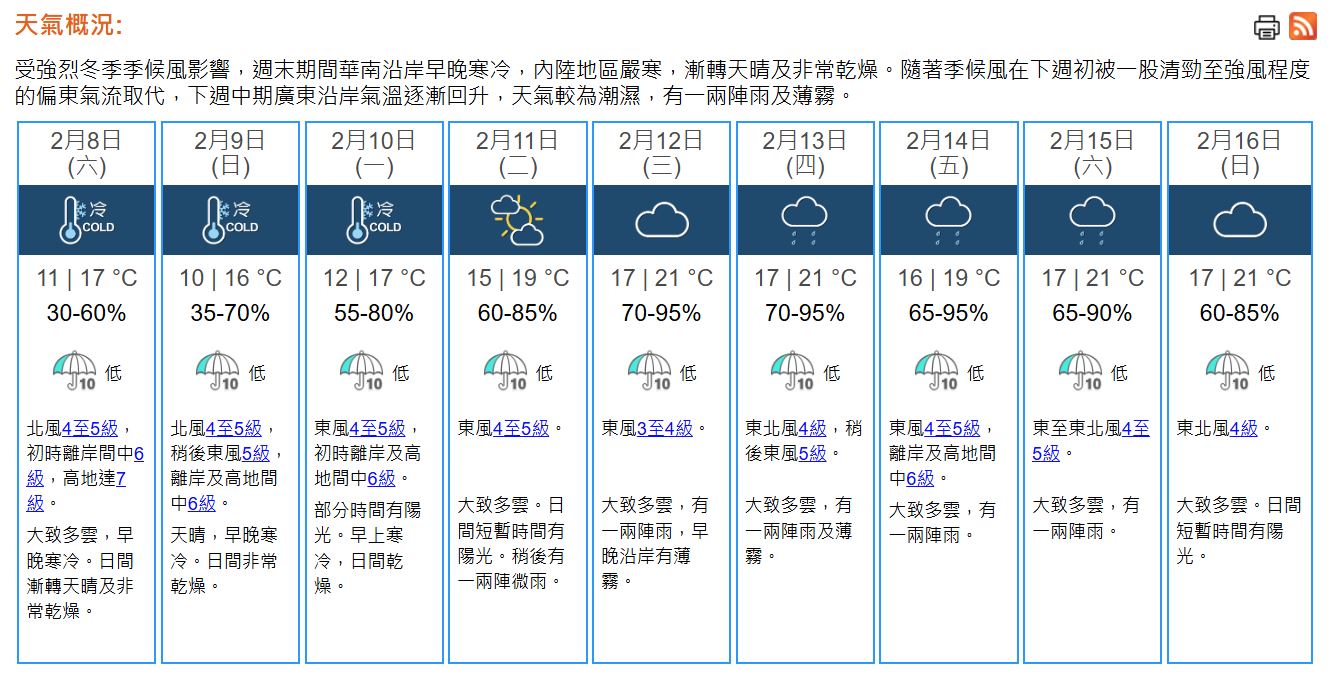 展望下周日(9日)市區最低氣溫在10°C左右,新界及高地嚴寒。下周一(10日)早上仍然寒冷。下周中期氣溫逐漸回升,雲量增多及較為潮濕。(天文台)