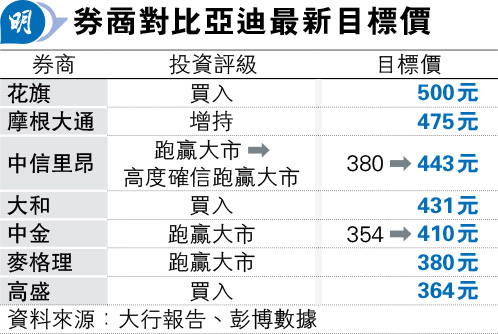 中信里昂則認為,比亞迪提供可負擔的自動駕駛技術方案將成為電動車市場競爭的「新戰場」,與外資品牌的燃油車、國內大眾市場車企競爭。該行預計,比亞迪L2+級別自動駕駛滲透率今年將提升至約40%,有助提升明年每輛車的盈利能力至1.2萬元,因此將投資評級上調至「高度確信跑贏大市」,目標價提高至443港元。