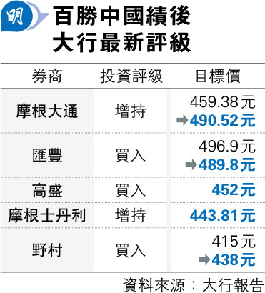 該行指出,公司正依循正確方向拓展特許經營店,加強肯德基及必勝客在低線城市的滲透率,建立多元化店舖並持續優化營運成本;而公司回饋股東的承諾提供了強大的價值定位。野村將百勝2025至2027年盈利增長預測上調至3%至5%,並將目標價由415元上調5.5%至438元,維持「買入」評級。
