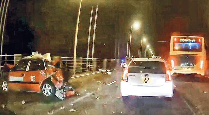 【明報專訊】青馬大橋昨日發生3車相撞交通意外。一輛的士往機場方向行駛時,因故障停在慢線,其後遭駛至的旅遊巴猛撼車尾,到場處理壞車事宜的交通警員亦被波及,人仰馬翻。交通警員及的士司機等3人受傷。