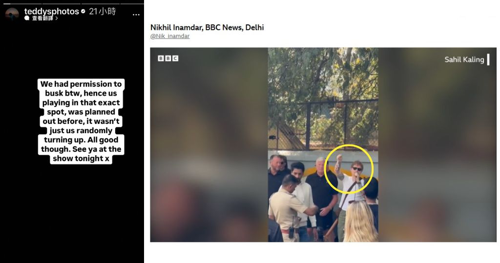 Ed Sheeran於印度南部城市班加羅爾(Bengaluru)舉行演唱會,開騷前他在街頭獻唱,其間遭到警員阻止。BBC報道的片段顯示,警員拔走他的咪線。當局解釋,為免人潮擠擁,此前已拒絕Ed Sheeran團隊街頭表演的申請。Ed Sheeran則在社交媒體Instagram表示,團隊是有得到許可,事前已有計劃,不是一時心血來潮。(BBC)