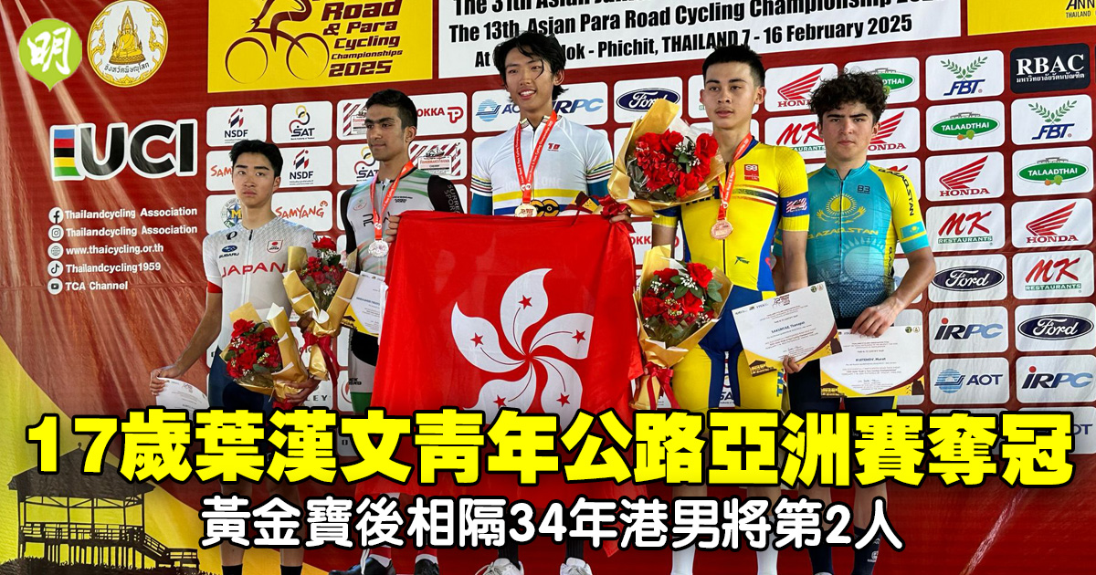 年僅17歲的中國香港單車隊新星葉漢文(Daniel)今(13日)在泰國彭世洛府舉行的公路單車亞洲賽,勇奪男子青年個人公路賽冠軍,成為繼34年前的「亞洲車神」黃金寶後,歷來第2名男子港將在此項目封王。