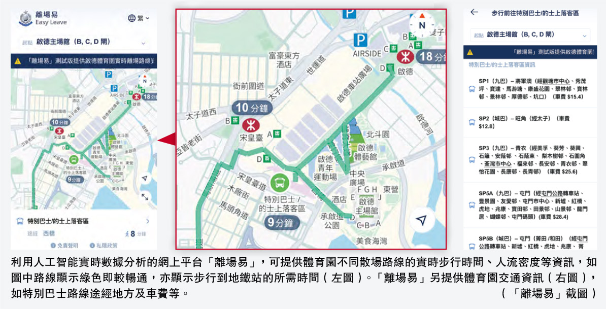 周一鳴稱,全港首個利用人工智能實時分析數據的網上平台「離場易」,是為配合體育園啟用,由跨部門演練小組成員共同推出,現時已可使用,平台提供不同散場路線的實時步行時間、人流密度及即時交通資訊,舉例路線顯示綠色即暢通、紅色則較擠擁。他指平台開發成本「有限」,但無透露具體金額。
