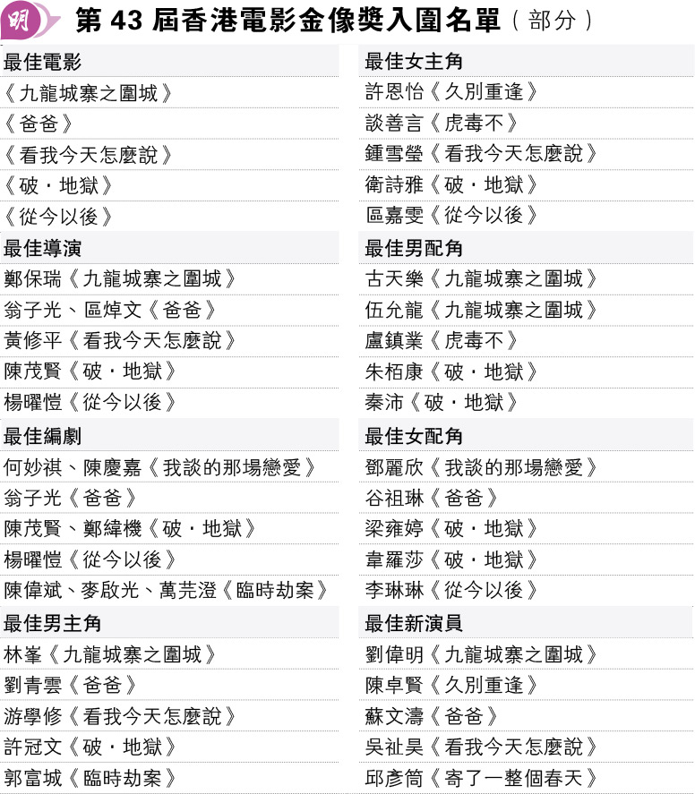 娛樂 第43屆香港電影金像獎入圍名單(部分) 發佈於 8 個月 前 2025 年 2 月 15 日 By 明報 【明報專訊】(請看附圖) 相關文章: Up Next 玩煙火險樂極生悲 郭富城護方媛舉動獲讚 不要錯過 【開箱】《美國隊長4:勇敢新世界》 政治驚慄包裝超級英雄片 繼續閱讀 贊助商 猜你喜歡