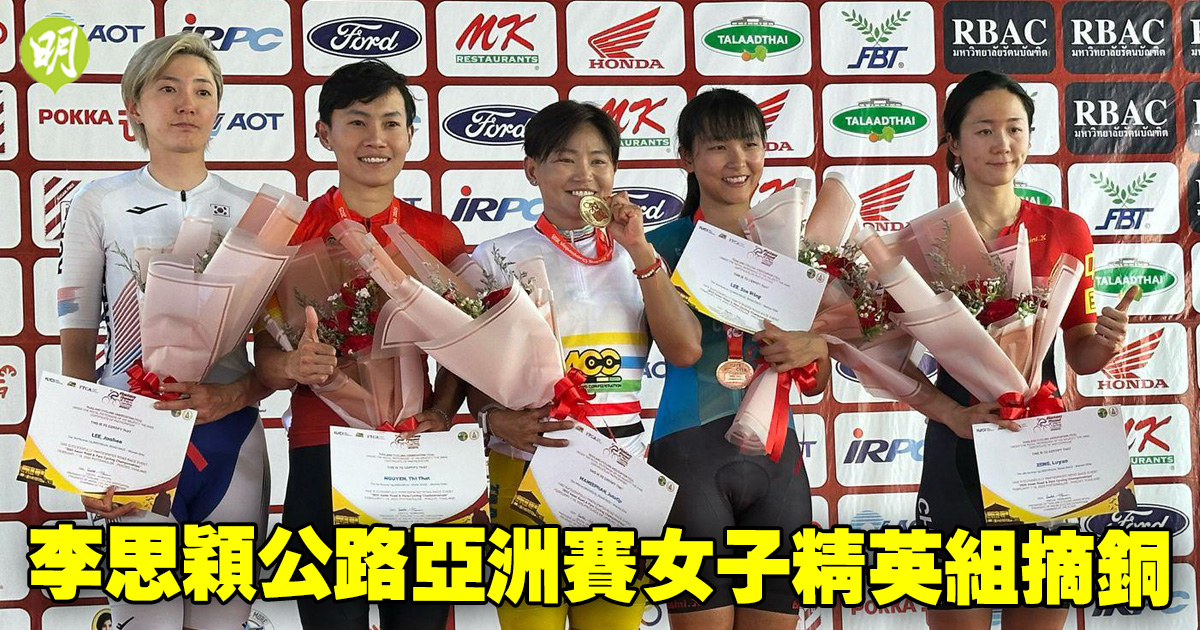 去年在巴黎初征奧運並拿下港隊女將最佳成績的李思穎,近日在泰國出戰公路單車亞洲賽,這名港隊「小車神」日前伙拍隊友在混合團體賽摘下一面銅牌後,今轉戰女子精英組個人賽,最終她隨第一主車群齊衝線,並以2小時43分05秒時間為自己增添一面銅牌,亦是繼2017年封后的楊倩玉之後,再有港將在此項目取得獎牌。至於楊倩玉今屆則以第26名完成,其餘港將梁穎儀及梁寶儀則分別以第15及30名完賽。而金、銀牌得主分別是泰國隊的瑪尼攀及越南隊的阮氏實。
