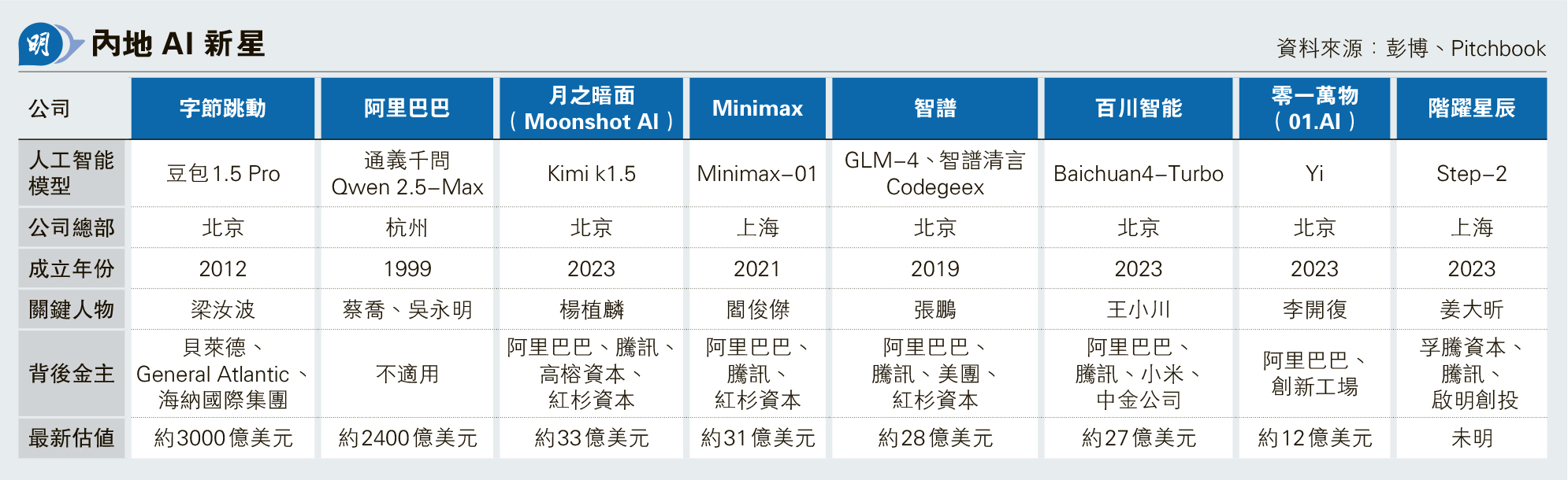 經濟 內地AI新星背後金主 多涉阿里騰訊紅杉 發佈於 8 個月 前 2025 年 2 月 16 日 By 明報 【明報專訊】自DeepSeek掀起全球對中國人工智能(AI)模型的關注,令市場重新思考AI是否非靠高端硬件不可,隨之也將目光投向近年內地其他AI新星。外媒整理了一些崛起中的企業及項目,當中不少都有共同的身影,包括阿里巴巴(9988)、騰訊(0700)、紅杉資本等,足見這些公司對中國AI饒有興趣,當中AI初創公司或項目的估值主要來自Pitchbook及彭博數據。 [企業地球村] 相關文章: Up Next 保單演示利率擬7月設限 港元單最高6厘 不要錯過 習近平據報開會撐民企 港股飈805點 馬雲馬化騰梁文鋒等將出席 科指升5%創3年高 繼續閱讀 贊助商 猜你喜歡