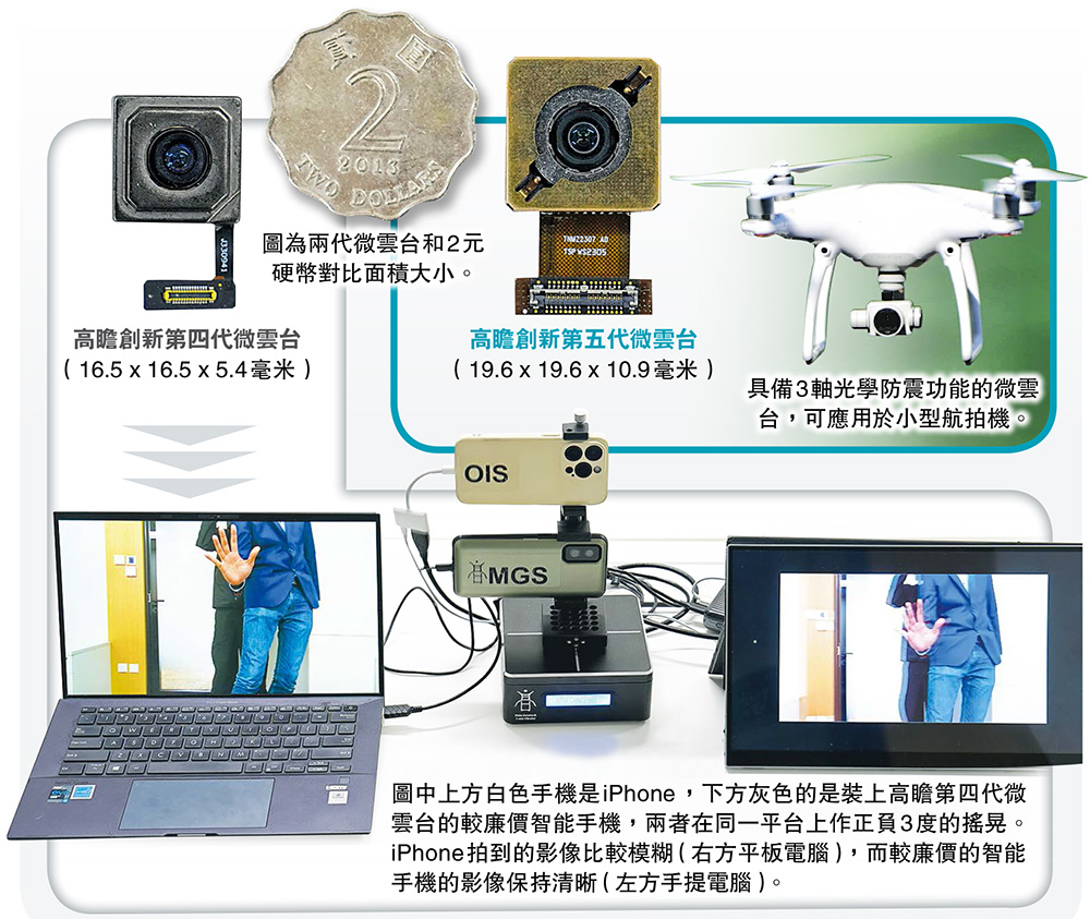 【明報專訊】光學防震技術能夠減低震動導致拍攝影像變得模糊。但由於重量和體積限制,現時的小型航拍機全都只安裝單軸或2軸光學防震的微雲台。不過,這種情况可能在幾個月後開始改變。有香港初創公司已研發出具備3軸光學防震功能的微雲台,足以應用於小型航拍機上。該公司更希望在一兩年後再推出「瘦身版」,令智能手機也具備3軸光學防震功能。