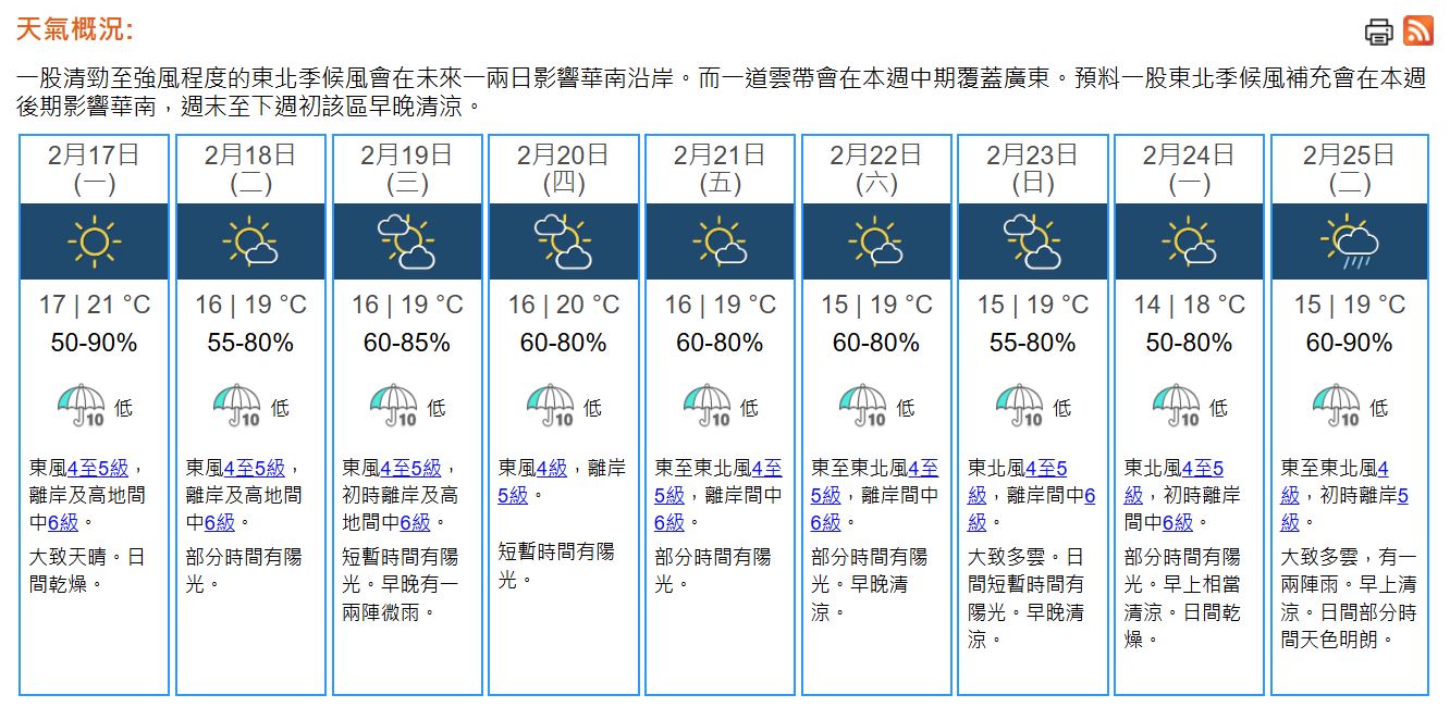 即時熱點 天氣|天文台:最高21°C 未來一兩日早上清涼 (08:41) 發佈於 8 個月 前 2025 年 2 月 17 日 By 明報 早上8時30分,天文台錄得氣溫18°C,相對濕度80%。 一股清勁至強風程度的東北季候風正影響廣東。本港地區今日(17日)大致天晴。日間乾燥,最高氣溫約21°C。吹和緩至清勁偏東風,離岸及高地間中吹強風。展望未來一兩日風勢頗大,早上清涼。周三(19日)雲量較多。本周後期部分時間有陽光。(天文台) 相關文章:天文台天氣天氣速遞編輯推介 Up Next 《哪吒之魔童鬧海》今起預售 內地票房破120億人民幣 一文睇《哪吒2》劇情及製作規模 (15:43) 不要錯過 大熊貓龍鳳胎外表如倒模 三點分辨「家姐」「細佬」 (10:34) 繼續閱讀 贊助商 猜你喜歡 風神|天文台:下周一考慮直接發三號波 將評估需否發更高風球 下周二至四料低至20°C (16:53) 天氣|天文台:周五有驟雨 氣溫28至32°C (19:45) 天氣|天文台:周四局部地區有驟雨 日間炎熱最高32°C (21:00) 天氣|天文台:今早多處地區錄5毫米雨量 今日多雲有驟雨 下午部分地區雨勢較大有雷暴 (09:20) 天氣|酷熱警告生效 天文台:周末有一兩陣驟雨 (08:22) 天氣|天文台:周四天晴局部地區有驟雨 最高32°C (20:56)