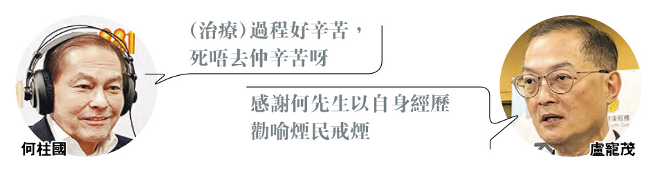 【明報專訊】前全國政協常委、商人何柱國前晚喺電台節目透露幾個月前發現患肺癌,已經康復,仲勸朋友戒煙,「我都係減咗唔食……因為(治療)過程好辛苦,死唔去仲辛苦呀!」醫衛局長盧寵茂噚日喺社交平台回應話「感謝何先生以自身經歷勸喻煙民戒煙,讓更多人明白煙害,從而決心遠離煙草」。
