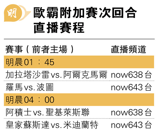 至於同日其餘7場歐霸附加賽當中,較矚目的有首回合靠日本國腳翼鋒久保建英奠勝贏2:1的西甲球隊皇家蘇斯達,手持2:1優勢返主場再戰丹麥的米迪蘭特;荷甲勁旅阿積士則帶着2:0領先返主場迎比利時的聖基萊斯聯。