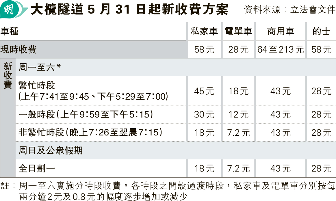 【明報專訊】立法會昨三讀通過大欖隧道新收費草案,欖隧5月31日起被政府收回後將實施新收費及「易通行」,私家車分時段收費,繁忙時段45元,一般時段30元,非繁忙時段18元;的士全日28元;貨車和巴士等商用車全日43元。實政圓桌立法會議員田北辰提出欖隧除繁忙時段外免費的修正案被否決,22名議員對修正案投棄權票。不少議員稱認同田北辰理念,但因政府稱欖隧免費會致財赤,故棄權。民建聯昨反對修正案,憂慮若欖隧免費,日後政府如因要控制車流重新收費,惹市民反感。
