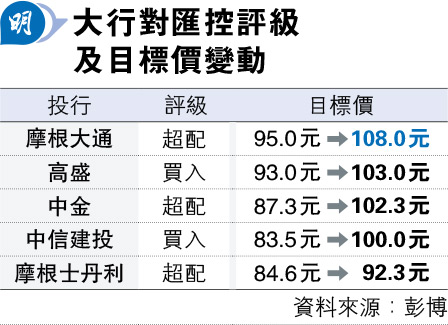 【明報專訊】匯控(0005)績後獲大行普遍唱好,據彭博綜合多間大行評級,摩根大通在績後上調目標價13.68%至108元,為各間大行中最高,高盛亦上調10.75%至103元,連同中金公司和中信建投分別給予102.3元和100元目標價,最少4間投行績後將匯控目標升至「紅底價」。昨日匯控回吐1.41%,收報87.15元。