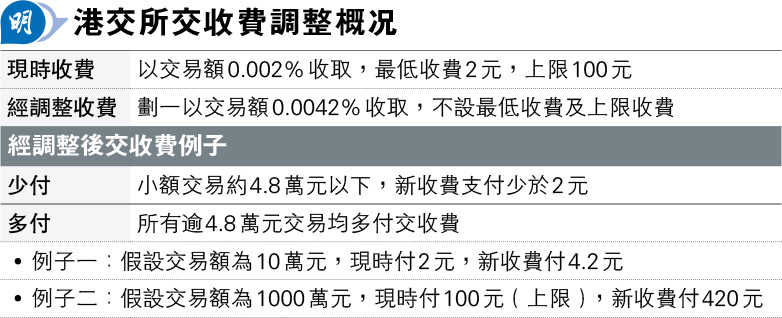按交收費新機制,所有交易額約為4.8萬元以下的股票交易,支付的交收費均較現時的2元最低收費為低;反之,所有交易額在約4.8萬元以上的交易,交收費均較現時高。以交易額10萬元為例,現時只付2元,新收費倍增至4.2元;假設交易額為1000萬元的大額交易,現付100元交收費上限,未來則增3.2倍至420元。