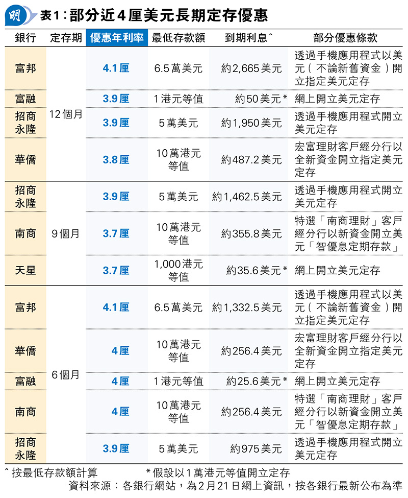 以富邦為例,該行個人銀行客戶透過手機應用程式以6.5萬美元(約50.7萬港元)或以上,開立12個月美元定存可獲4.1厘特優年利率,即最少可賺2665美元(約2.08萬港元)利息。部分虛擬銀行更可在不設最低開立定存金額門檻下,提供近4厘年利率,如富融的12個月美元定存年利率便達3.9厘(表1)。