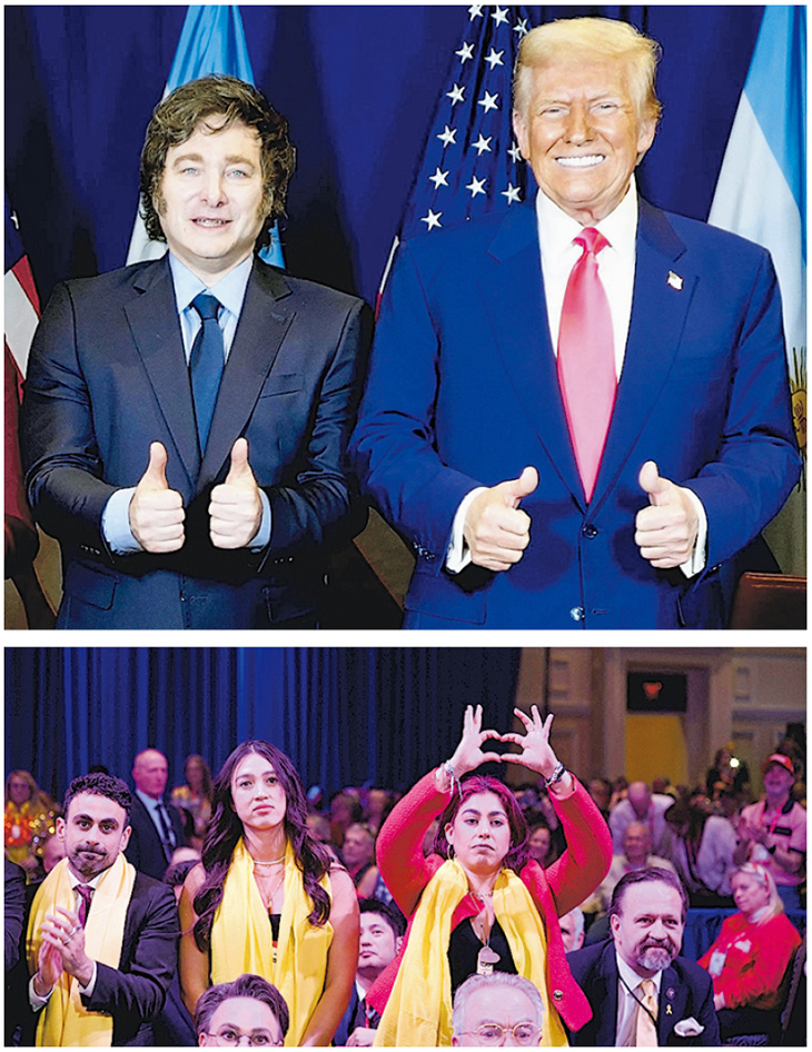 【明報專訊】阿根廷總統米萊伊(上圖左)上周六在美國馬里蘭州舉行的「保守派政治行動會議」(CPAC)會場,與他視為「意識形態盟友」的美國總統特朗普(上圖右)做出類似手勢同框合照。米萊伊期間大讚特朗普政府的對等關稅計劃,並表示他想讓阿根廷成為世上第一個加入美國對等貿易協議的國家。另外,特朗普在CPAC發言談及哈馬斯2023年10月綁走人質,強調帶人質歸家是重要的。其間他認出觀眾席之間的兩名獲救以色列人質。他稱她們是「一群漂亮的人」及與現場觀眾一起為她們鼓掌,其間女人質阿加馬尼等人起立和做手勢回應(下圖)。