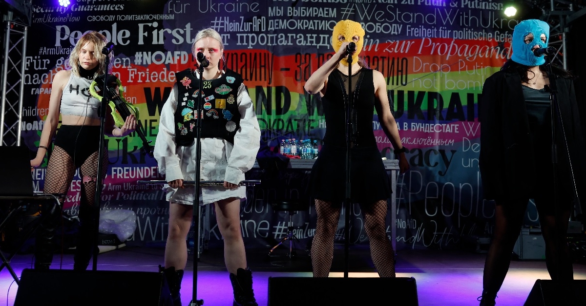 德國大選周日(23日)投票,選舉前夕俄羅斯反政府樂隊Pussy Riot在柏林一場挺烏克蘭的示威中表演。