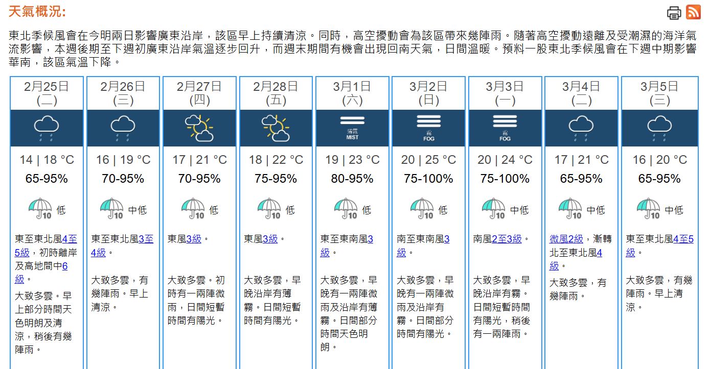 即時熱點 天氣|天文台:有雨最高18°C 周末期間潮濕有薄霧 (08:13) 發佈於 8 個月 前 2025 年 2 月 25 日 By 明報 上午8時,天文台錄得氣溫15°C,相對濕度72%。東北季候風正影響廣東沿岸。同時,一道雲帶覆蓋該區及南海北部。 本港地區今日(25日)天氣預測大致多雲。早上部分時間天色明朗及清涼。日間最高氣溫約18°C。稍後有幾陣雨。吹和緩至清勁東至東北風,初時離岸及高地間中吹強風。 展望明日(26日)有幾陣雨,早上清涼。本周後期氣溫逐步回升。周末期間潮濕及有薄霧,日間溫暖。(天文台) 相關文章:天文台天氣天氣速遞編輯推介 Up Next 2元乘車優惠●財政預算案2025|短片:2元乘車優惠設限 有長者體諒有嘆車費增 (15:58) 不要錯過 韓國即日起啟用電子入境申報 (12:25) 繼續閱讀 贊助商 猜你喜歡 天文台上午8時40分錄18.4°C 今年入秋以來最低 (09:03) 天文台取消所有熱帶氣旋警告信號 (18:20) 天氣|天文台:周三有幾陣雨 市區最低19°C (20:57) 風神 | 緩慢趨向西南 海口3港停運 (00:34) 風神|教育局:幼稚園及部分特殊學校明日停課 (17:33) 天文台:下午5時20分直接發出三號強風信號 (12:06)