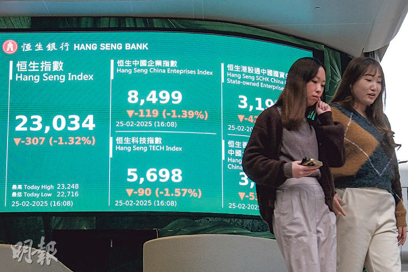 【明報專訊】美國總統特朗普表示,下月將如期向加拿大及墨西哥徵收新關稅,令市場對關稅憂慮再現,亞太區股市普遍偏軟,日經指數跌近1.4%、台股跌逾1%、韓國股市亦跌0.6%。特朗普上周五簽署「美國優先投資政策」行政命令,限制美國資金投資中國高科技行業,拖累中概股指數隔晚急跌逾5%,港股昨裂口低開逾600點,一度失守兩萬三關,之後跌幅收窄,收報23,034點,跌307點;科指曾跌逾4%,創逾3個月最大跌幅,惟大市成交連續第3個交易日逾3000億元;北水淨入亦見一周最多。