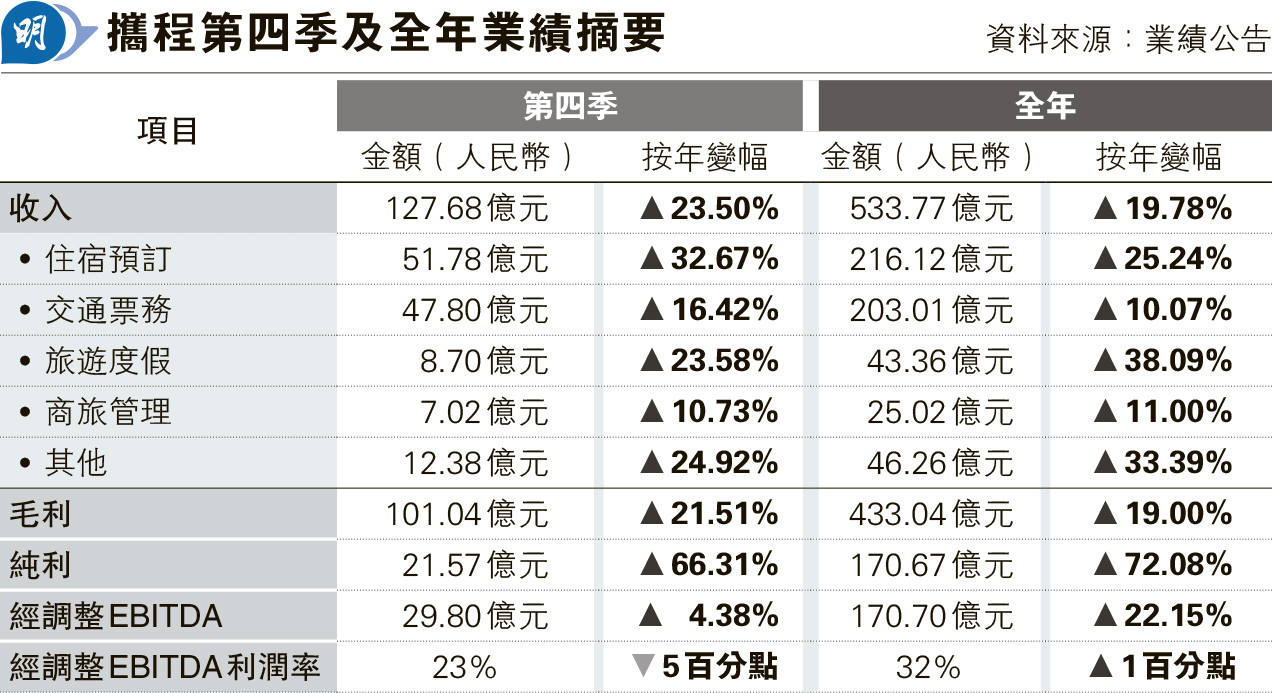 分類收入方面,第四季度住宿預訂收入錄得51.78億元,按年上升32.7%,主要得益於住宿預訂增長;至於交通票務及旅遊度假,亦分別受惠需求增長,帶動收入同時錄得雙位數升幅。(見表)
