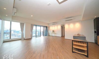 事實上,單位樓層高度達約3.3米,即使在加設吊櫃的位置下,亦不會感覺壓迫。睡房則採用趟門設計,節省開關門的空間,而浴室設於房內,形成套廁格局,除鏡櫃外,亦設入牆儲物櫃。至於單位客飯廳、睡房均開則方正,家具擺位較易設計。