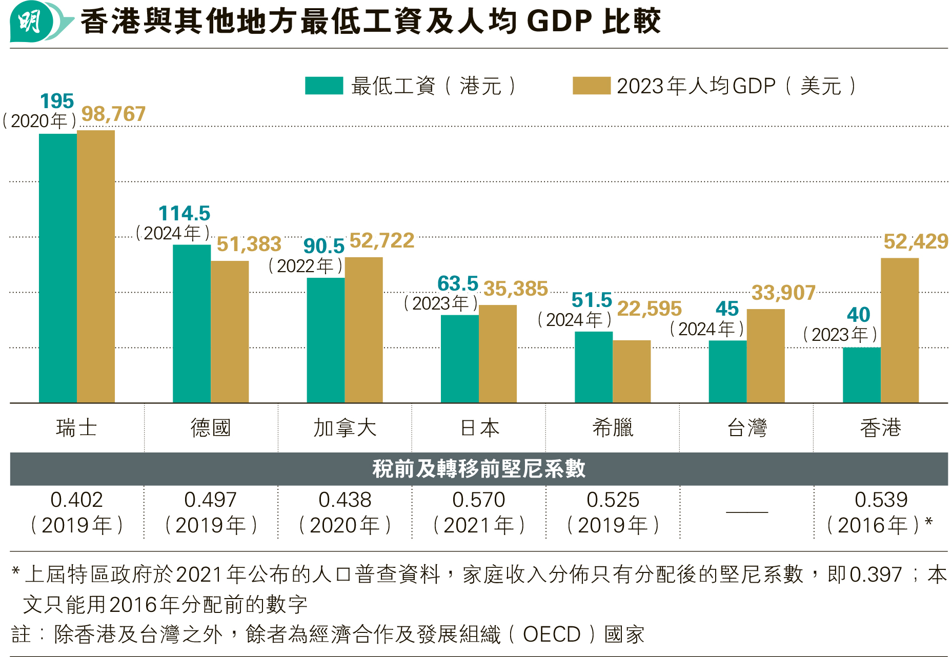 若我們將香港最低工資與本地生產總值人均所得(GDP per capita)相若的國家或地區,以及其分配前堅尼系數比較一下,或許有些啟發。