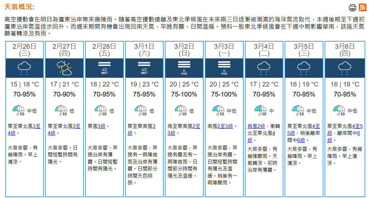 即時熱點 天氣|天文台:周三有雨 最低氣溫15°C (21:36) 發佈於 7 個月 前 2025 年 2 月 25 日 By 明報 天文台表示,東北季候風正影響廣東沿岸,同時與高空擾動相關的雲雨帶正覆蓋廣東及南海北部。周三(2月25日)大致多雲,有幾陣雨,早上清涼,最低氣溫約15°C,日間最高氣溫約18°C ,吹和緩東至東北風。展望隨後一兩日氣溫逐步回升。周末至下周一(3月3日)潮濕及有霧,日間溫暖。 相關文章:天文台天氣天氣速遞編輯推介 Up Next 2元乘車優惠●財政預算案2025|短片:2元乘車優惠設限 有長者體諒有嘆車費增 (15:58) 不要錯過 韓國即日起啟用電子入境申報 (12:25) 繼續閱讀 贊助商 猜你喜歡 麥德姆 | 廣東轉移逾15萬人 7市啟動應急響應 (00:59) 天文台改發三號強風信號 至少維持至今晚10時 (12:20) 麥德姆|三號風球至少維持至今晚10時 天文台將評估需否改發更高警告信號 (12:20) 天氣|天文台:天晴酷熱最高33°C 稍後有狂風驟雨及雷暴 (10:05) 麥德姆|天文台:三號強風信號至少維持至周日中午12時 麥德姆凌晨至早上最接近本港 (21:55) 天文台:三號強風信號至少維持至周日中午12時 (21:55)