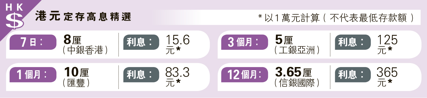 經濟 港元定存匯豐銀行1個年息10厘 發佈於 8 個月 前 2025 年 2 月 27 日 By 明報 【明報專訊】港元定存匯豐銀行推出優惠,只需完成一項股票交易,可獲享額外10厘年利率的1個月港元定期存款優惠。 相關文章: Up Next 金管局余偉文:政府增發債 市場料受落 不要錯過 會所分兩大部分 庭園洋溢歐陸色彩 繼續閱讀 贊助商 猜你喜歡