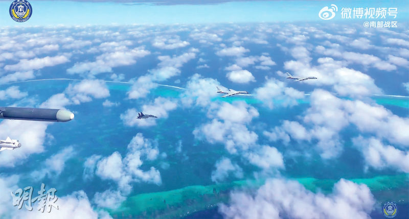 南部戰區在社交媒體帳號發放巡航短片顯示,兩架戰機護航下,兩架轟6K遠程轟炸機在黃岩島上空低飛掠過,並與海上巡航的三亞號、郴州號導彈護衛艦通話,獲告知120公里外有一批空中目標。南部戰區稱,2月以來,戰區部隊組織海空兵力持續加強黃岩島領海周邊海空域巡邏警戒,進一步強化有關海空域管控力度。