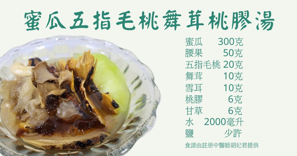天氣潮濕,天文台預測周末至下周一(3月3日)相對濕度達100%。註冊中醫師胡玘君表示,這種天氣容易周身骨痛,適合用五指毛桃煲湯飲用,並提供湯水食譜「蜜瓜五指毛桃舞茸桃膠湯」,湯內有雪耳配桃膠,亦有助紓緩皮膚痕癢不適。一般人及濕疹患者可飲用,痛風患者及舞茸過敏者不宜。