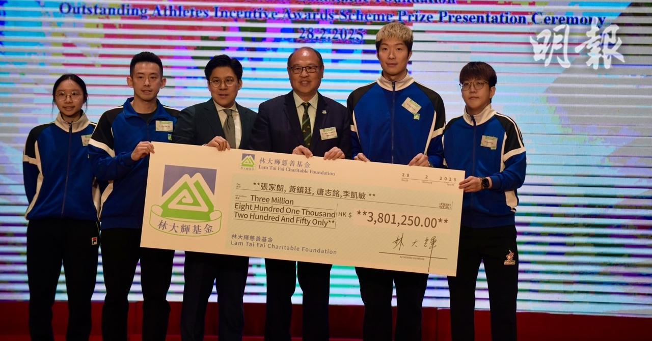 林大輝中學今午在校內舉行「林大輝慈善基金傑出運動員獎勵計劃」頒獎典禮,向張家朗及乒乓的黃鎮廷、李凱敏和唐志銘4名港隊代表校友頒發獎金,嘉許他們傑出成就和對香港貢獻,港協暨奧委會副會長及立法會議員霍啟剛出席主禮。其中2014年畢業張家朗及2009年校友黃鎮廷,分別獲得337.5萬及37.5萬元獎金,他們亦將戰衣等捐贈給母校展示。今次為4名港將共派發380萬零1250元獎金。張家朗台上分享時鼓勵師弟妹遇到挫折時不要氣餒,正如他的座右銘「Don’t lose your way」,不要忘記初衷。此外,同時舉行該校自資興建樓高8層的藝術及文化發展中心奠基典禮,預計明年9月1日前落成啟用。