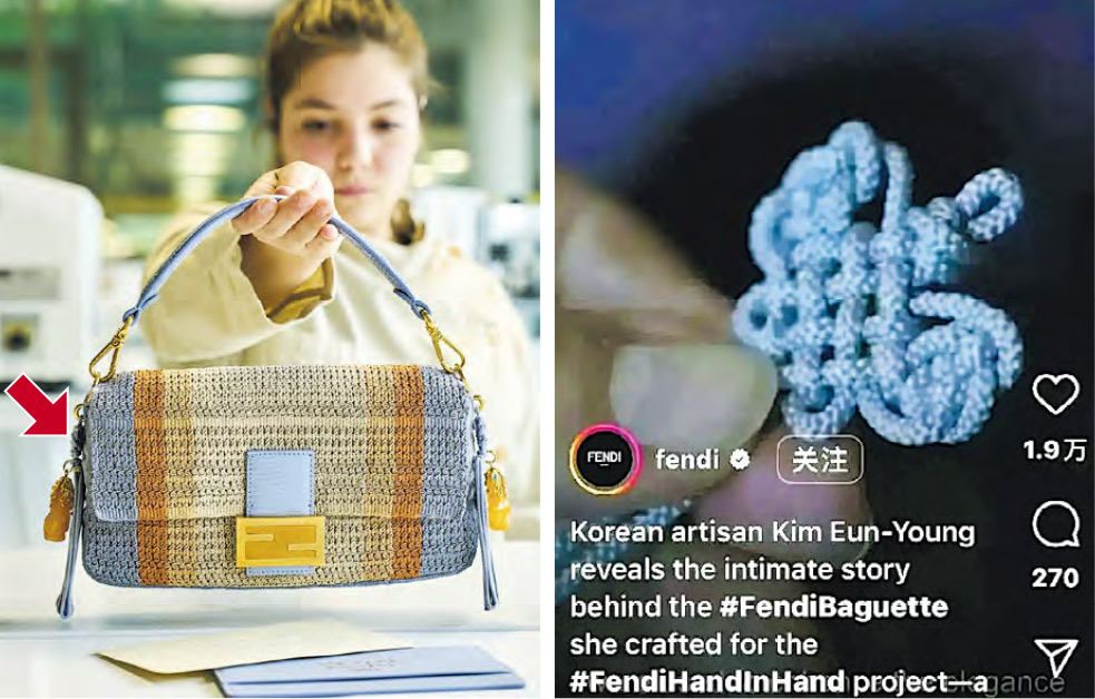 FENDI去年11月推出「攜手共創」(Hand in Hand)計劃,其中一款Baguette手袋是與韓國傳統繩結大師金恩榮(Kim Eun-young,音譯)合作,品牌宣傳指設計融入韓國繩結技巧,尤其是傳統上用於朝鮮王朝禮袍的「網綬」圖樣。