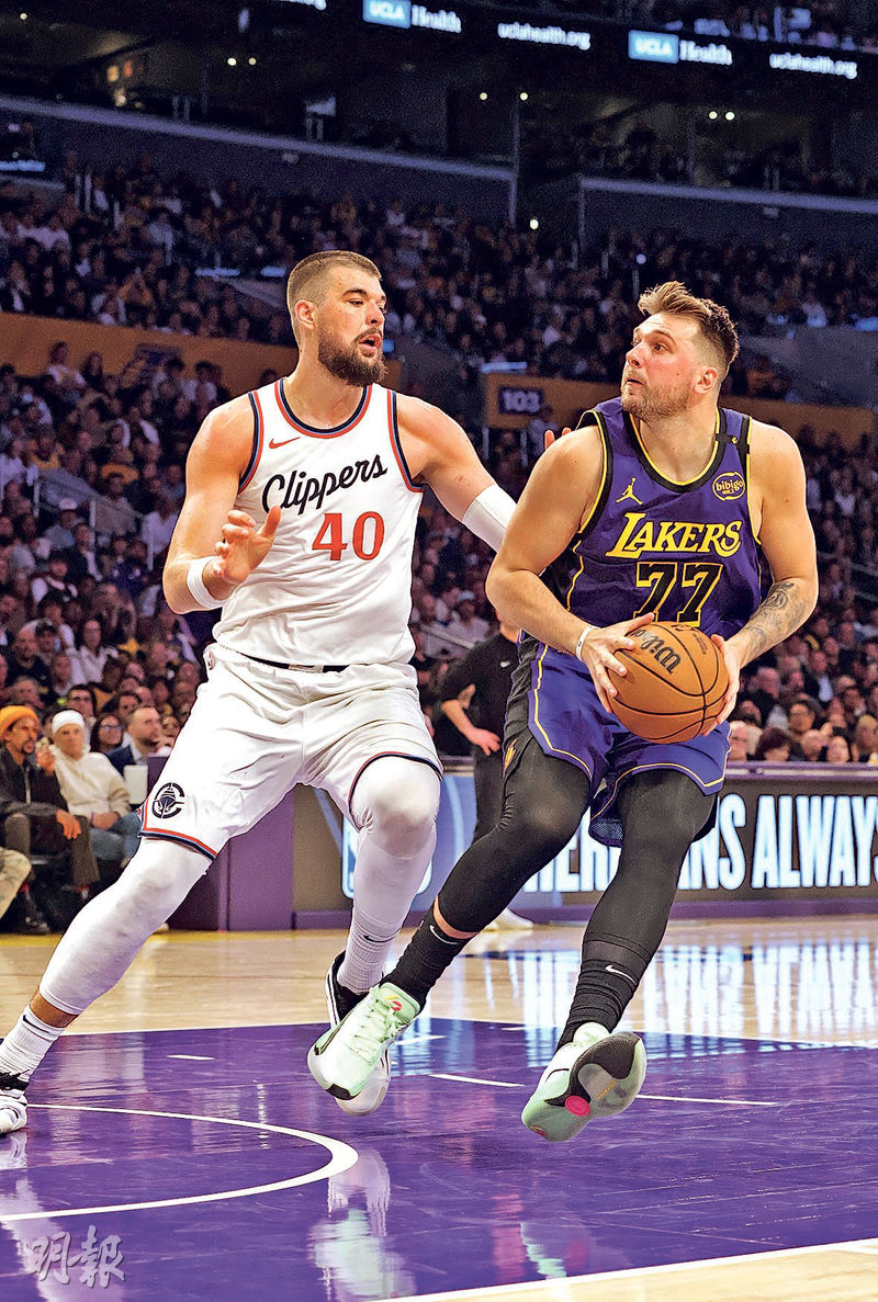 【明報專訊】洛杉磯湖人昨在NBA常規賽「洛城打吡」雖有前鋒八村壘賽前左膝扭傷缺陣,加上韋列士在首節尾段因小腿痠痛傷退,但仍憑適逢26歲生日的星級後衛盧卡當錫獨取全場最高31分及「大帝」勒邦占士攻入28分,領銜主場以106:102擊敗同市的洛杉磯快艇,奪得五連捷。