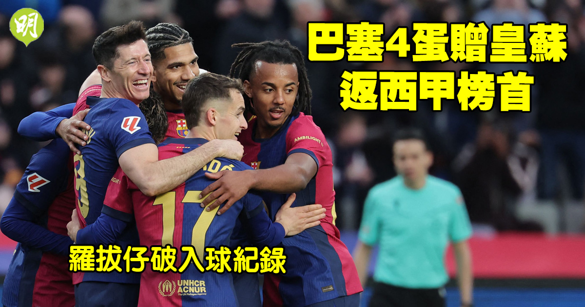 西甲勁旅巴塞隆拿今晨(3日)在主場迎戰皇家蘇斯達,藉4名球員貢獻入球下以4:0大勝,賽後壓過馬德里體育會重登西甲榜首,為球隊埋齋的鋒將「羅拔仔」羅拔利雲度夫斯基更打破加盟以來個人入球紀錄。