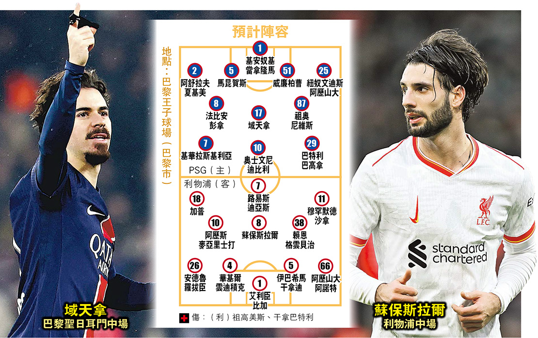 【明報專訊】在法甲和英超同遙領13分居首的巴黎聖日耳門(PSG)及利物浦,將於明晨在巴黎王子公園球場上演的歐聯16強首回合交鋒,兩軍射手奧士文尼迪比利與穆罕默德沙拿勢成焦點外,勝負分野或取決於近况勇銳的「紅軍」中場蘇保斯拉爾會否又有神來之筆,以及正如法國隊名宿拿保夫所言,對方能否避過被域天拿等3名PSG中場「如狗般的追咬」。