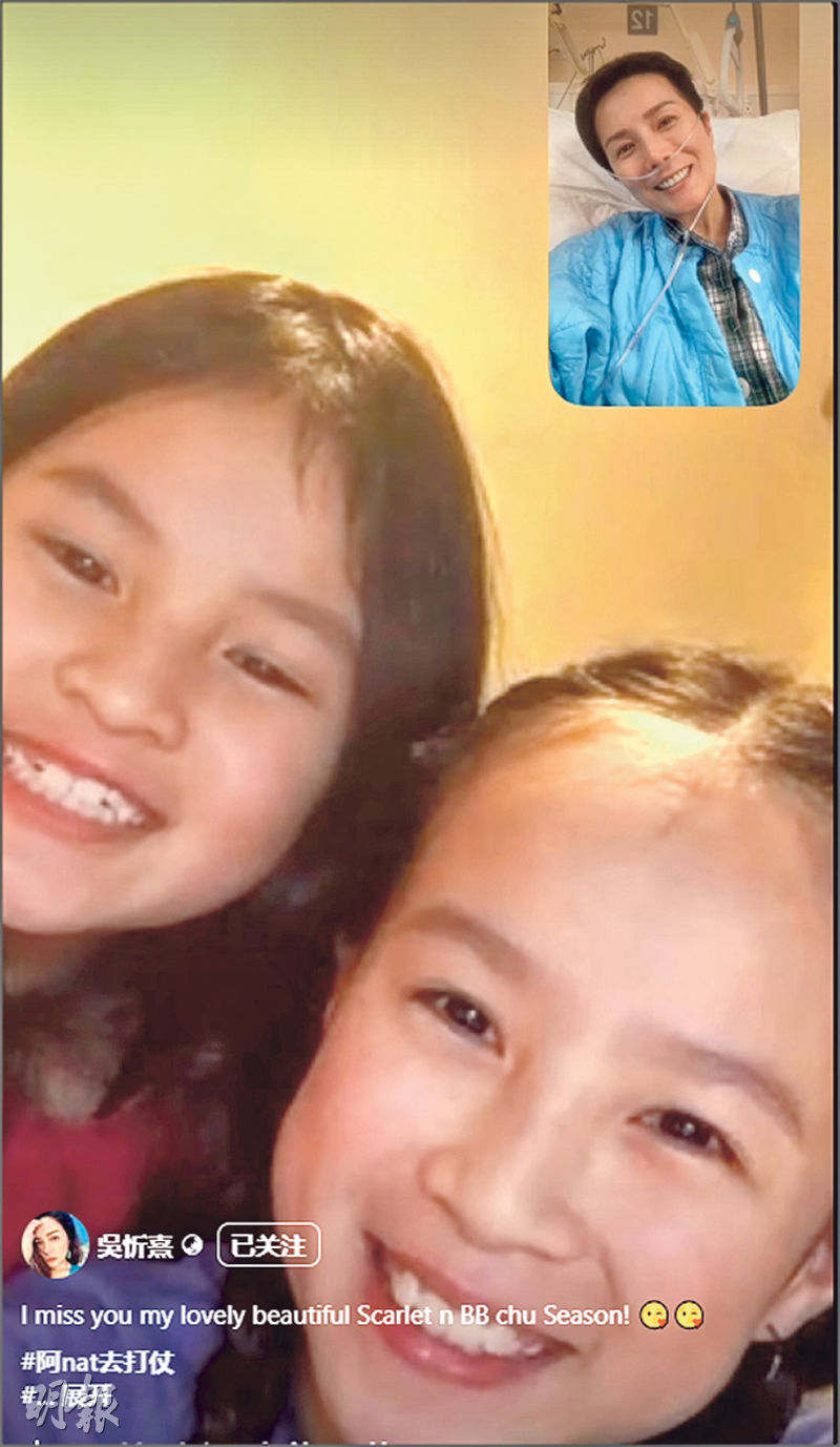 吳忻熹留醫近半個月,雖受癌病煎熬,仍積極、勇敢面對,近日將與兩女視像通話截圖製成影片上載社交平台,最初見她精神不錯,與女有講有笑,還隔空惜她們,之後的截圖,她臉色有點蒼白及疲累,更有鼻上插喉截圖,狀况令人擔憂。