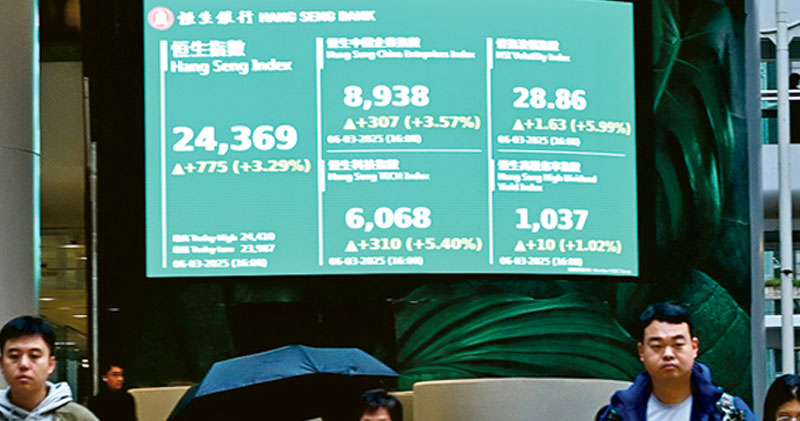 【明報專訊】美國放寬對加拿大和墨西哥的部分關稅改善外圍投資氣氛,加上港股繼續熱炒中央支持AI、創新科技發展,帶動恒指昨日再勁升775點,收報24,369點,再創3年新高,兩日累升逾1400點,兼且回補2022年2月的下跌裂口,大市成交金額亦增至3771億元。科技股繼續狂奔,騰訊控股(0700)、阿里巴巴(9988)同大升約8%,快手(1024)升15.7%成為升幅最大藍籌股。昨日人大經濟主題記者會上多次提到金融支持科技創新,證券界料有助科技股繼續尋頂。