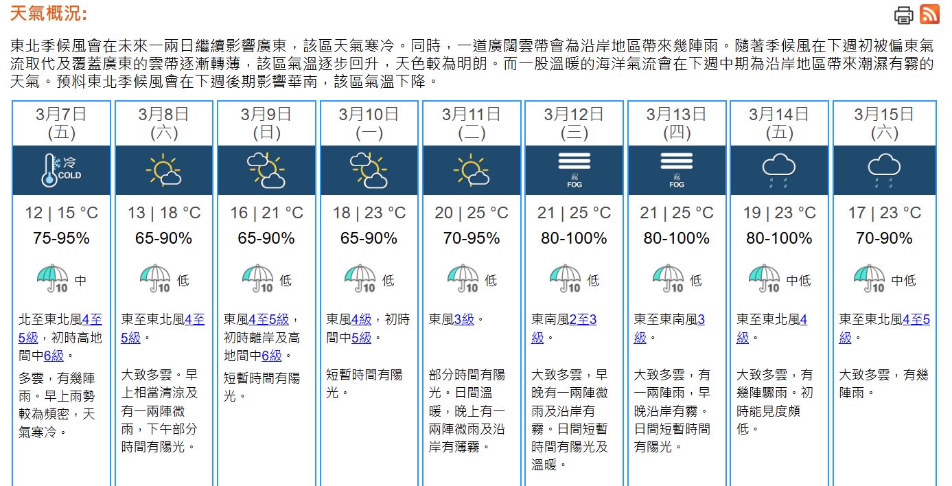 即時熱點 天氣|天文台:周五早上雨勢頻密 最低12°C (21:42) 發佈於 7 個月 前 2025 年 3 月 6 日 By 明報 天文台表示,東北季候風正影響華南沿岸,而一道廣闊雲帶亦為該區帶來幾陣雨,預測本港地區今晚(6日)及明日(7日)天氣預測多雲,有幾陣雨。今晚及明早雨勢較為頻密,天氣寒冷,市區最低氣溫約12°C,新界再低一兩度。日間最高氣溫約15°C。吹和緩至清勁北至東北風,晚間高地間中吹強風。 展望周六(8日)早上氣溫仍然較低。下周初氣溫逐漸回升,天色較為明朗。下周中期漸轉潮濕有霧,日間溫暖。(天文台) 相關文章:天文台天氣天氣速遞編輯推介 Up Next 菜心助控制血糖血壓 營養師教烹煮菜心貼士 提醒避吃菜心花 (15:00) 不要錯過 天氣|天文台:明日早晚相當清涼 市區最低14°C (17:07) 繼續閱讀 贊助商 猜你喜歡 周末近天文大潮 強颱料入400公里 天文台考慮周五晚發出一號戒備信號 (12:07) 麥德姆|麥德姆周六進入本港800公里範圍 央視:料為華南地區帶來明顯風雨 (11:27) 天氣|酷熱警告生效 天文台:周四周五天晴酷熱 周六驟雨漸增 (08:14) 麥德姆|央視:料麥德姆為華南地區帶來明顯風雨 (13:40) 天氣|天文台:大致天晴 日間酷熱及乾燥 (08:17)
