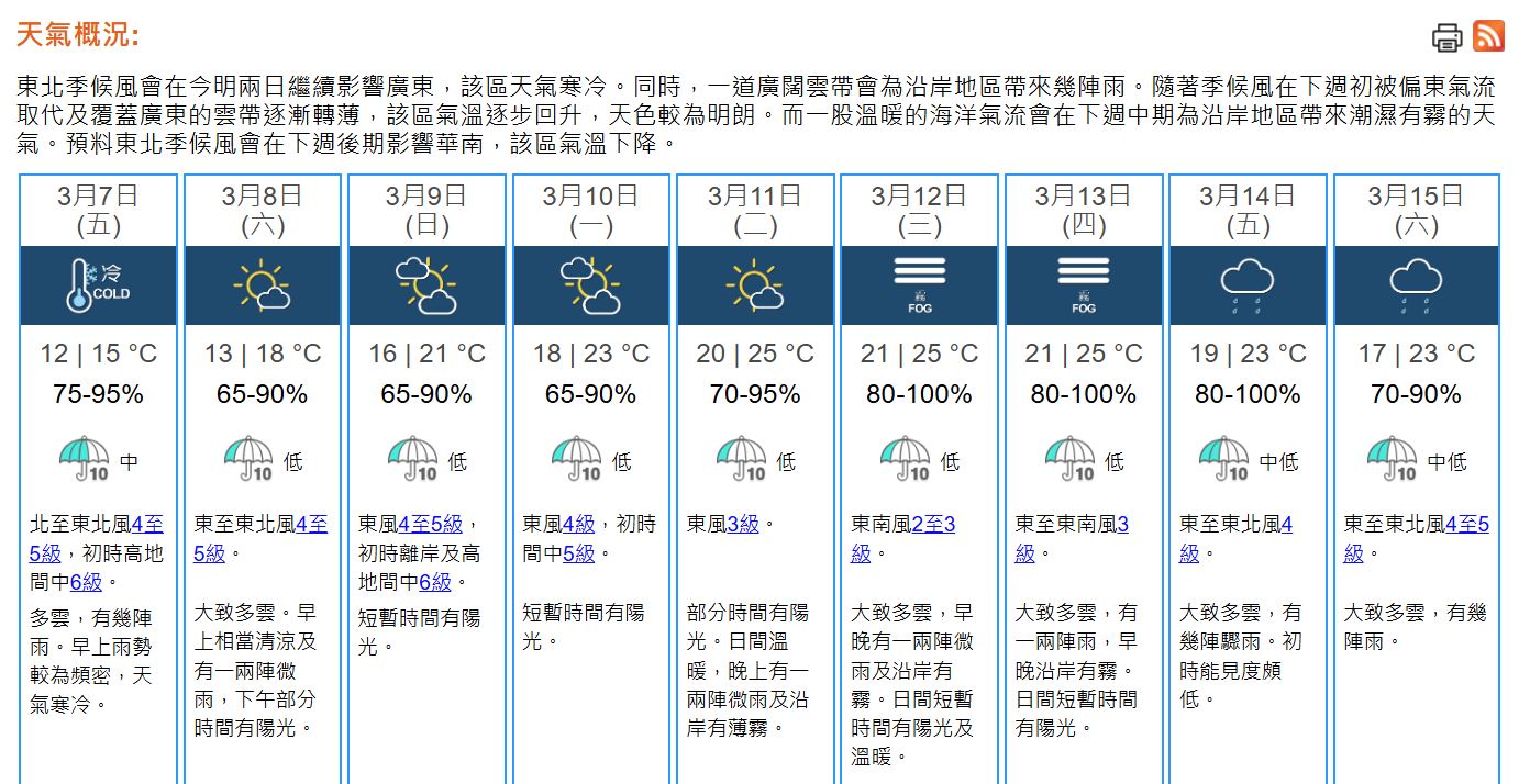 即時熱點 天氣|天文台:早上雨勢較頻密 最高15°C (08:22) 發佈於 8 個月 前 2025 年 3 月 7 日 By 明報 上午8時,天文台錄得氣溫13.6°C,相對濕度83%。 受東北季候風影響,華南天氣寒冷。本港方面,今早(7日)氣溫普遍降至12°C左右。此外,一道廣闊雲帶亦為廣東帶來有雨的天氣。 本港地區今日多雲,有幾陣雨。早上雨勢較為頻密,天氣寒冷。日間最高氣溫約15°C。吹和緩至清勁北至東北風,初時高地間中吹強風。 展望明早(8日)氣溫仍然較低。下周初氣溫逐漸回升,天色較為明朗。下周中期漸轉潮濕有霧,日間溫暖。(天文台) 相關文章:天文台天氣天氣速遞編輯推介 Up Next 短片:30年樓齡自置公屋翻新提升採光度空間感 硅藻土牆身吸濕防霉 (14:13) 不要錯過 黃花風鈴木|短片:機場黃花風鈴徑 市民賞黃金花海 (14:05) 繼續閱讀 贊助商 猜你喜歡 風神|天文台:下周一考慮直接發三號波 將評估需否發更高風球 下周二至四料低至20°C (16:53) 天氣|天文台:周五有驟雨 氣溫28至32°C (19:45) 天氣|天文台:周四局部地區有驟雨 日間炎熱最高32°C (21:00) 天氣|天文台:今早多處地區錄5毫米雨量 今日多雲有驟雨 下午部分地區雨勢較大有雷暴 (09:20) 天氣|酷熱警告生效 天文台:周末有一兩陣驟雨 (08:22) 天氣|天文台:周四天晴局部地區有驟雨 最高32°C (20:56)