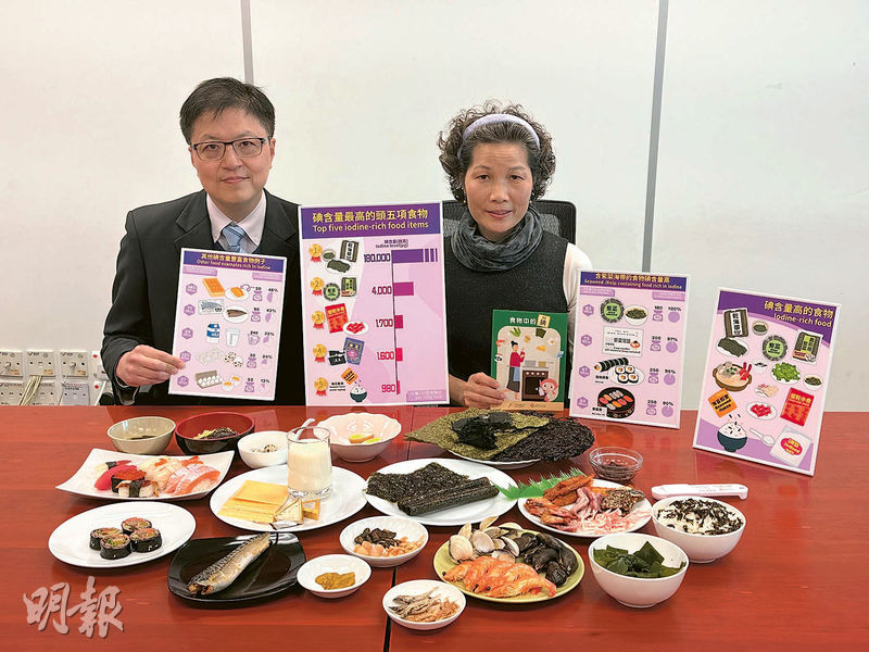 據衛生署前年研究,35歲或以上港人碘攝取不足,有輕度缺碘。食安中心顧問醫生張勇仁提醒,碘攝取不足可損害腦部發育、引致甲狀腺腫脹即「大頸泡」、心情低落、易疲等,建議市民可在膳食中加入高碘食物,又舉例孕婦可服用碘補充品。他強調患甲狀腺疾病人士應就碘攝取量諮詢醫生意見。食安中心科學主任林伏波提醒市民可多用蒸煮方法烹調食材,除了更健康,亦較易保存食物中的碘。