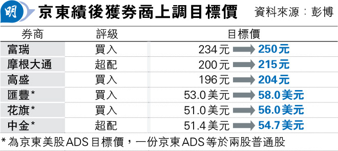 【明報專訊】京東(9618)去年第四季純利大升1.91倍至98.54億元(人民幣,下同),勝市場預期,京東績後獲各券商唱好兼上調目標價(見表)。當中匯豐環球研究發報告指出,以舊換新計劃將續推動京東今年增長,另基於供應鏈效率進一步改善,預計毛利率將擴闊,再加上公司過去嚴控成本的紀律,匯豐分別將京東今年及明年的盈利上調9%至11%,維持「買入」評級,另將京東美股預託證券(ADS)目標價,由53美元上調至58美元。