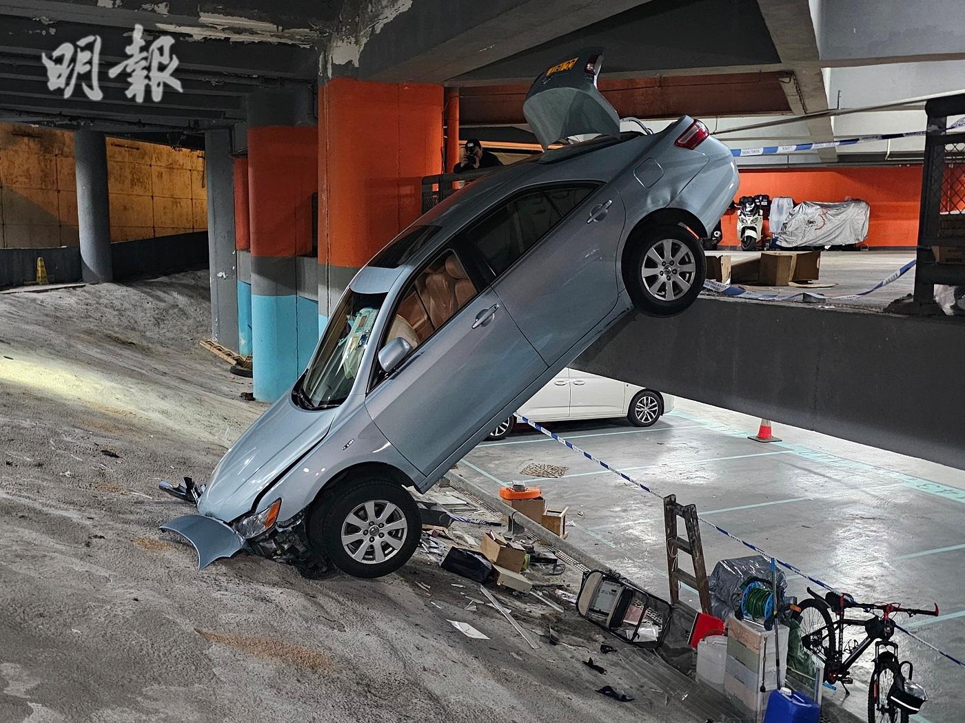 現場所見,涉事淺藍色私家車卡在停車場地庫一樓及地庫二樓之間,車頭嚴重損毀變形,「鬼面罩」飛脫,車尾箱被打開,玻璃碎片散落一地。警方用膠帶封鎖涉案範圍。