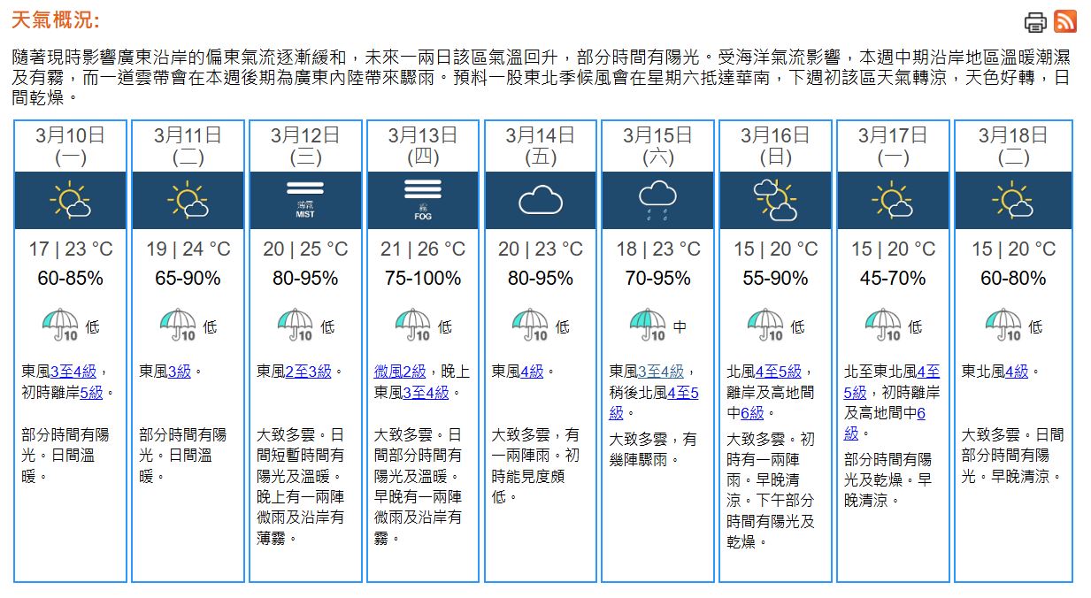 即時熱點 天氣|天文台:周一17°C-23°C 部分時間有陽光 (19:10) 發佈於 7 個月 前 2025 年 3 月 9 日 By 明報 一股偏東氣流正影響廣東沿岸。本港方面,下午大部分地區相對濕度曾下降至百分之六十以下。本港地區今晚(9日)及明日(10日)天氣預測:大致多雲,明早最低氣溫約17°C,日間部分時間有陽光及溫暖,最高氣溫約23°C。吹和緩東風,初時離岸風勢清勁。展望隨後兩三日部分時間有陽光,日間溫暖。本周中後期天氣潮濕及沿岸有霧。(天文台) 相關文章:天文台天氣天氣速遞編輯推介 Up Next 日本地震研究:北海道千島海溝累積巨大能量 足以引發9級大地震 (16:17) 不要錯過 短片:30年樓齡自置公屋翻新提升採光度空間感 硅藻土牆身吸濕防霉 (14:13) 繼續閱讀 贊助商 猜你喜歡 周末近天文大潮 強颱料入400公里 天文台考慮周五晚發出一號戒備信號 (12:07) 麥德姆|麥德姆周六進入本港800公里範圍 央視:料為華南地區帶來明顯風雨 (11:27) 天氣|酷熱警告生效 天文台:周四周五天晴酷熱 周六驟雨漸增 (08:14) 麥德姆|央視:料麥德姆為華南地區帶來明顯風雨 (13:40) 麥德姆 | 珠西海域漁船明晚全部回港避風 (21:56)