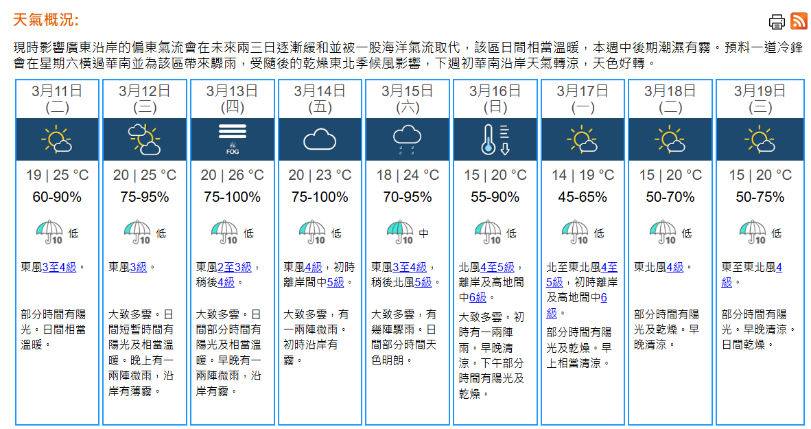 即時熱點 天氣|天文台:周二日間溫暖最高25°C 周末北風增強氣溫漸降 (21:28) 發佈於 7 個月 前 2025 年 3 月 10 日 By 明報 天文台表示,一股偏東氣流正影響廣東沿岸,同時一道雲帶覆蓋南海北部,大致多雲,初時有一兩陣微雨,周二(11日)最低氣溫約19°C,日間部分時間有陽光及相當溫暖,市區最高氣溫約25°C,新界再高一兩度,吹和緩東風。展望隨後兩三日漸轉潮濕,沿岸有霧。周末期間北風逐漸增強,氣溫開始下降。下周初早晚天氣清涼。 相關文章:天文台天氣天氣速遞編輯推介 Up Next 大阪世博2025|大阪世博最大場館「未來的城市」預展【多圖】 (15:44) 不要錯過 短片賞花:秋英 2025維園花展主題花 (15:01) 繼續閱讀 贊助商 猜你喜歡 天文台改發三號強風信號 至少維持至今晚10時 (12:20) 麥德姆|三號風球至少維持至今晚10時 天文台將評估需否改發更高警告信號 (12:20) 天氣|天文台:天晴酷熱最高33°C 稍後有狂風驟雨及雷暴 (10:05) 天文台:考慮今晚發一號戒備信號 將評估需否明日日間改發更高警告信號 (08:47) 今年襲港熱帶氣旋共12個 「掛波」次數破1946年以來紀錄 (20:07) 天文台:一號風球周五中午前維持 考慮下午改掛三號風球 (19:45)