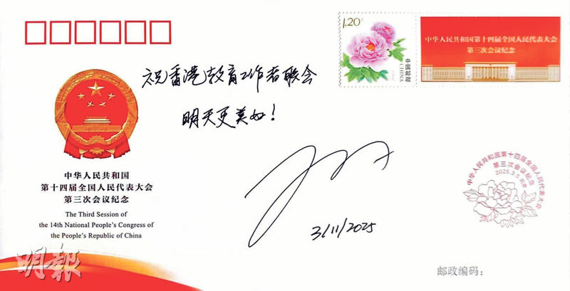 【明報專訊】全國人大會議噚日喺北京閉幕,唔少人代趁機交朋友、影相打卡。港區人大代表、教聯會主席黃錦良就話,噚日有幸同小米集團董事長雷軍隔一個位坐,一齊喺人民大會堂審議多份工作報告及交流,佢仲收到禮物,就係有雷總簽名嘅人大紀念封,上面寫住「祝香港教育工作者聯會明天更美好」。