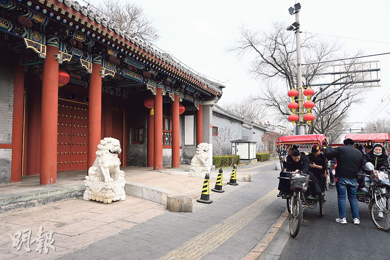 記者近日所見,大院正門是典型京式風格,一對石獅、兩扇朱門、四盞燈籠,精緻的樑柱雕花,氣派不凡,但大門緊閉,窗戶也完全被窗簾遮住,除了一塊門牌外,沒有其他標誌。與之相鄰的單位,黑色鐵閘同樣緊閉,門外有監控攝像頭。兩個單位臨街一側有一段圍牆較矮,其上鋪設帶刺鐵絲網。