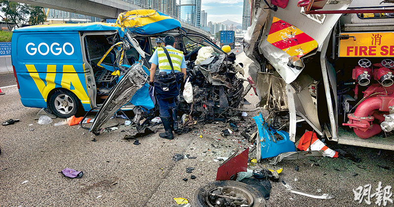 【明報專訊】油麻地昨午發生奪命車禍。一輛車身印有GoGoVan標誌的客貨車沿西九龍公路往葵涌方向行駛,猛撼停在快線處理另一宗交通事故的消防車,客貨車車頭毁如廢鐵,司機送院不治。GoGoX平台確認涉事司機正處理訂單,屬保險涵蓋範圍內。