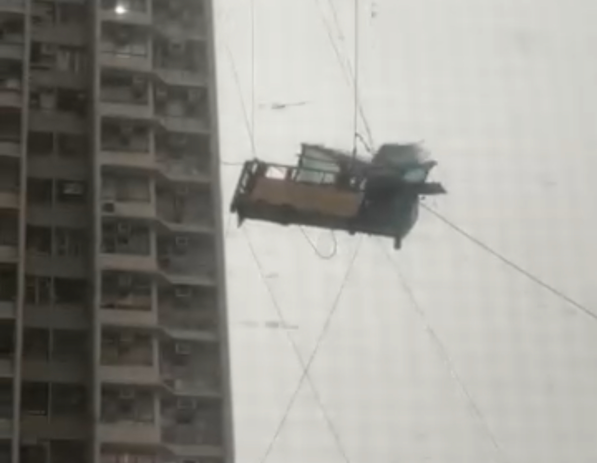 【23:57更新】警方今午(15日)3時許接報,指天水圍天瑞邨瑞心樓有吊船遭強風吹至遠離大廈外牆,被困工人高呼求救。救援人員接報到場,將工人安全帶回室內安全位置,事件中沒有人受傷。從網上片段所見,涉事吊船在大廈約10樓位置,被強風吹至遠離外牆左搖右擺傾斜,吊船仍有多條鋼索牽引,被困工人緊握吊船,吊船的帆布及圍板亦被吹至飛脫,附近大量雜物被捲至半空。