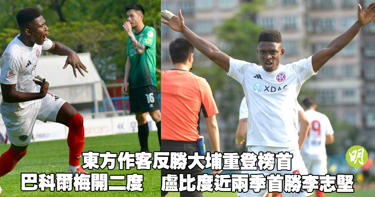 港超今午(16日)榜首大戰,東方藉下半場2分鐘內連入兩球,以及射手巴科爾梅開二度,作客大埔運動場以3:1反勝大埔,賽後以1分反壓對方重登榜首。