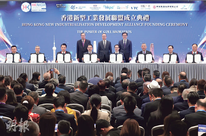 政府早於去年《施政報告》提出推動成立「香港新型工業發展聯盟」。聯盟昨正式成立,8個創會成員包括工總、廠商會、生產力局、科技園公司、職訓局、工程師學會、中銀集團投資有限公司、香港新型工業化聯盟。典禮有500名業界代表出席,包括工商界、專上院校、研發中心、投資界、金融界等。